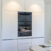 Forma sa rotunjita a fost posibil de realizat cu materialului HIMACS piatra acrilica naturala datorita proprietatilor unice de termoformare si imbinare invizibila.Blatul de lucru a fost fabricat tot din acest material datorita proprietatilor de curaare usora si igiena si care se imbina invizibil cu chiuveta, dintr-o bucata.