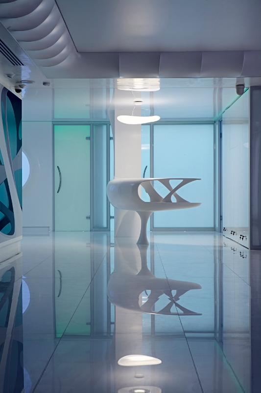 Pe langa corpurile de mobilier avangardiste puse la dispozitia clientilor, HI-MACS® a fost folosit si la fabricarea mobilierului din zonele medicale ale acestei clinici.