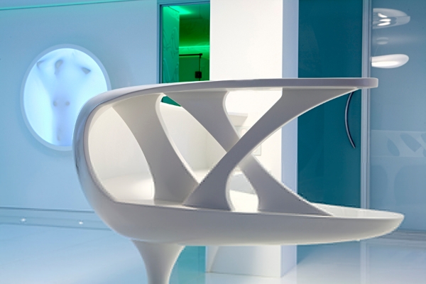 Realizarea acestei forme unice si neobisnuite a fost posibila datorita proprietatii materialului HI-MACS® de a se termoforma in orice forma dorita.