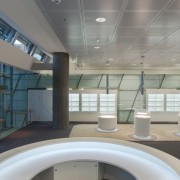 Aceasta forma s-a dovedit a fi perfecta pentru acest tip de amenajare in conditiile in care cerintele impuneau realizarea unui spatiu interior care sa fluidizeze procedurile bancare si interactiunea cu clientii.