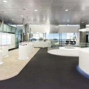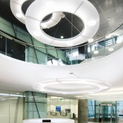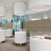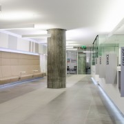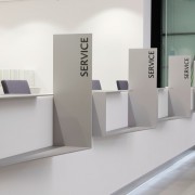 Deoarece toate piesele importante de mobilier au fost realizate din materialul HI-MACS® Lucent Opal, toate zonele functionale din acest spatiu au fost conectate vizual, incepand cu corpul receptiei din zona de intrare si pana la biroul de schimb valutar situat la nivelul al doilea al cladirii.