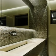 “Tema amenajarii intregii case a fost inca de la inceput foarte bine definita: design si functionalitate fara compromis, iar baia matrimoniala nu a facut exceptie.  Mai intai am dat forma spatiului astfel incat sa indeplineasca functiile unei bai cu un confort ridicat, apoi am pus culoare si textura pentru a obtine un spatiu cu o atmosfera calda, cu un aer usor mistic. Spatiul in sine si materialele puse la dispozitie au fost decisive in obtinerea acestui rezultat.” Adriana Tihon | Atvangarde Design Team.