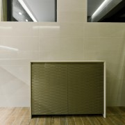 Pentru fronturile corpurilor de depozitare s-a folosit MDF vopsit cu finisaj metalizat lucios, un finisaj pretios, potrivit atmosferei create. Pentru a desavarsi aceasta amenajare fronturile mobilierului au fost prelucrate CNC cu decorul Waves.